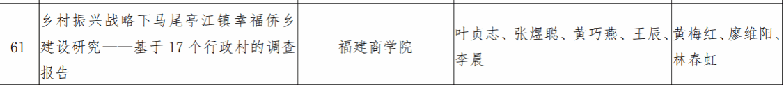 近日,第十六届“挑战杯”福建省大学生课外学术科技作品竞赛落下帷幕,澳门网投官方网站项目《乡村振兴战略下马尾亭江镇幸福侨乡建设研究——基于 17 个行政村的调查报告》(项目成员:21级日语3班叶贞志、21级日语2班张煜聪、20级日语2班黄巧燕、20级日语1班王辰、20级商务英语2班李晨,指导老师:黄梅红、廖维阳、林春虹),在全省61所高校1343件作品中脱颖而出,荣获三等奖。据悉,这是澳门网投官网学生首次在“挑战杯”福建省大学生课外学术科技作品竞赛中获奖,实现了在“挑战杯”比赛上的重大突破。
