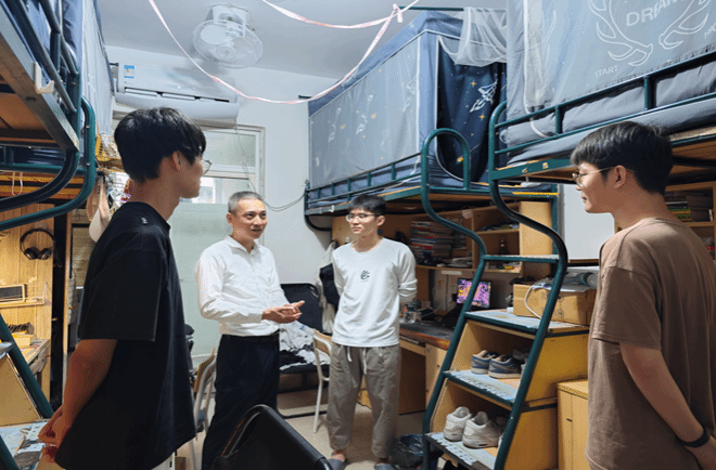 在走访过程中,林书记与同学们亲切交谈,详细了解同学们在生活、学习和未来规划等情况,并提出衷心建议和指导。他鼓励学生要珍惜大学时光,调整好学习状态,做好学习规划,扎实学好专业本领,不断提升自身综合素养。同时,林书记悉心叮嘱同学们要注意宿舍卫生,用电安全问题,保持良好的生活习惯,合理安排作息时间。