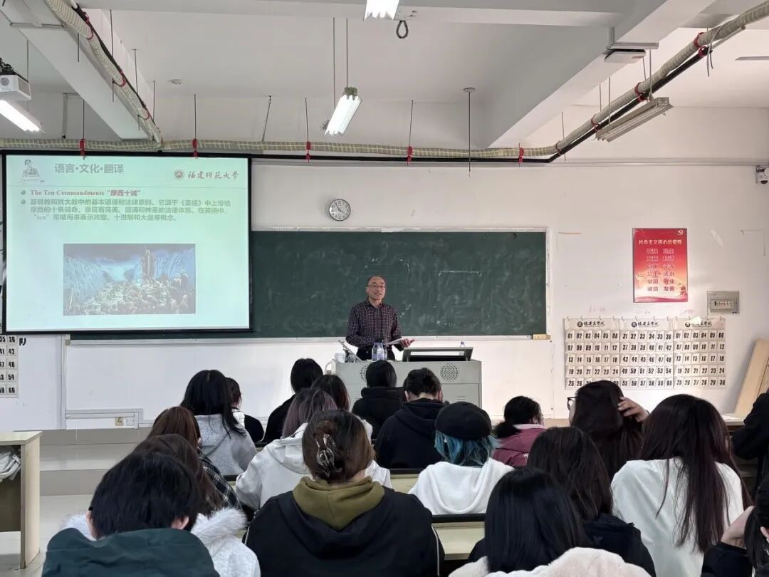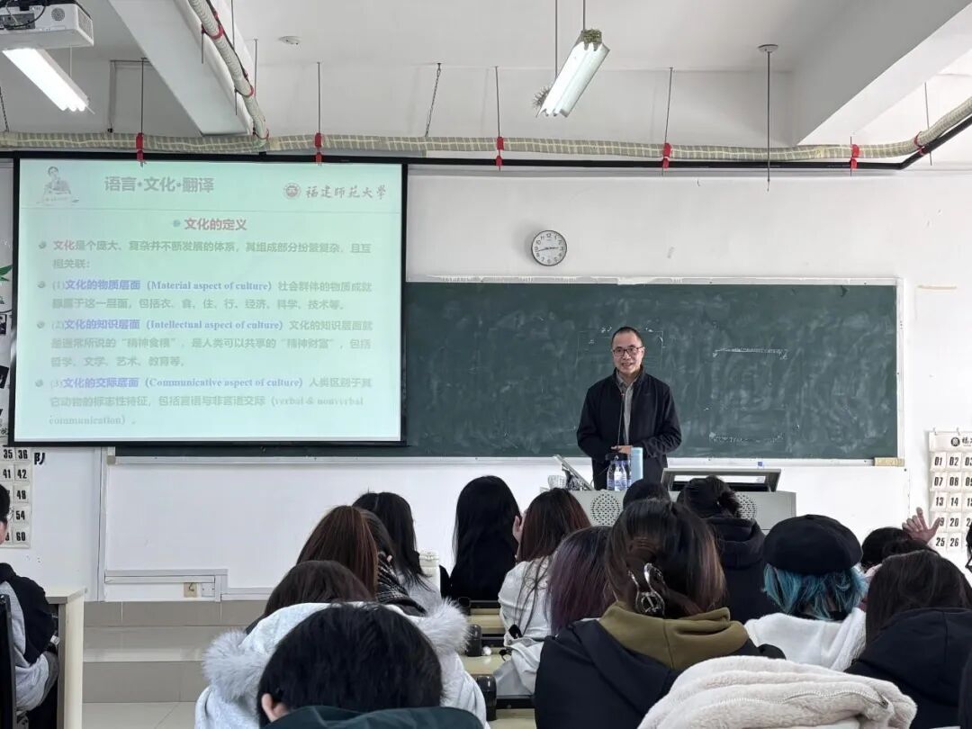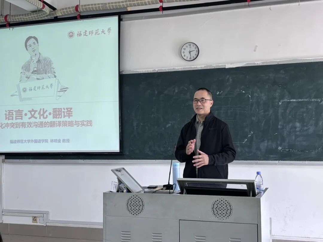 为拓展澳门网投官网学生国际视野,提升国际传播能力,12月5日下午,福建师范大学林明金教授应邀莅临澳门网投官网,作题为“语言·文化·翻译——从文化冲突到有效沟通的翻译策略与实践”的专题讲座。讲座由副院长童成寿主持,澳门网投官网各年级学生代表参加了此次活动。