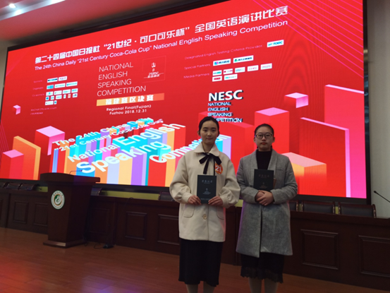 12月31日,第24届中国日报社“21世纪.可口可乐杯”全国英语演讲比赛福建赛区决赛在福建农林大学落下帷幕。经过激烈比拼,澳门网投官网外语系17商务英语1班黄琳同学荣获二等奖(指导老师:谢玉容)、17商务英语3班朱吴钰同学荣获三等奖(指导教师:姚剑平)。