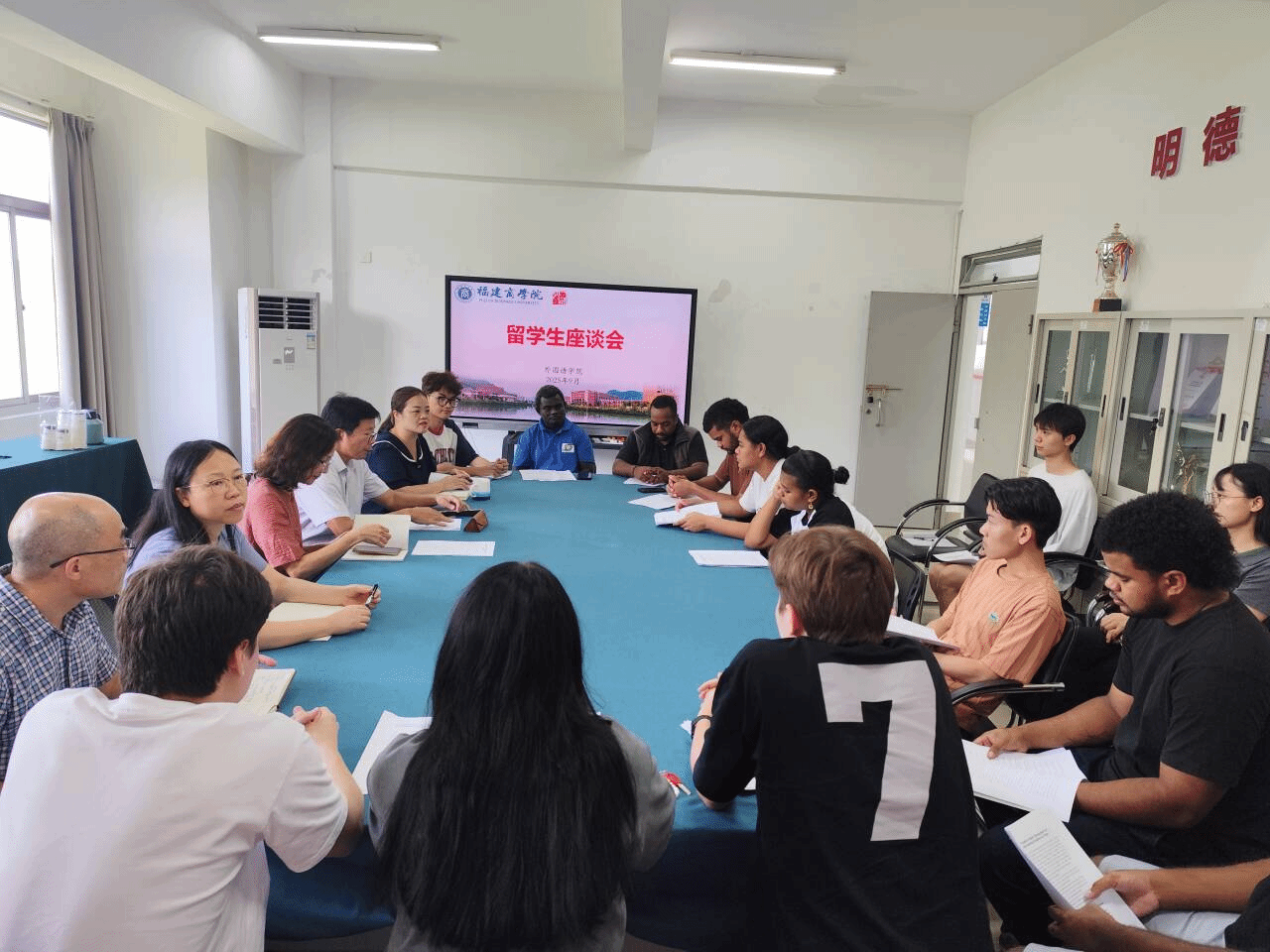 为强化国际留学生在校纪律意识,规范日常行为管理,引导留学生在华安心学习、依规生活,保障在校学习生活安全稳定,9 月29日,对外合作处和澳门网投官方网站联合召开国际留学生座谈会。对外合作处处长何文贤、澳门网投官方网站院长池玫、副书记杨爱娥、副院长范云霞、副院长童成寿参加会议。会上,对外合作处和澳门网投官方网站党政领导结合国际留学生管理规定,为12名留学生详细讲解校园日常学习、生活中的纪律规范,并对国庆中秋双节假期的人身安全、财物安全等方面进行教育提醒,希望留学生们积极融入中国文化生活,认真学习中华文化和专业知识,积极参加各类第二课堂活动,做中外文化交流使者。
