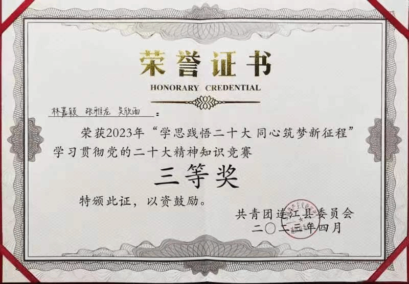 2023年4月25日,由共青团连江县委员会主办,共青团澳门网投官方网站委员会、共青团福州理工学院委员会承办,澳门网投官方网站学生协办2023年的“学思践悟二十大,同心筑梦新征程”学习贯彻党的二十大知识竞赛决赛于连江校区明德楼学生活动中心举行。由澳门网投官方网站20级商务英语3班张雅龙,21级商务英语2班林嘉颖,21级日语1班吴欣雨三位同学组成的澳门网投官方网站第一代表队在竞赛中沉着冷静、协助作答,最终荣获三等奖的好成绩。