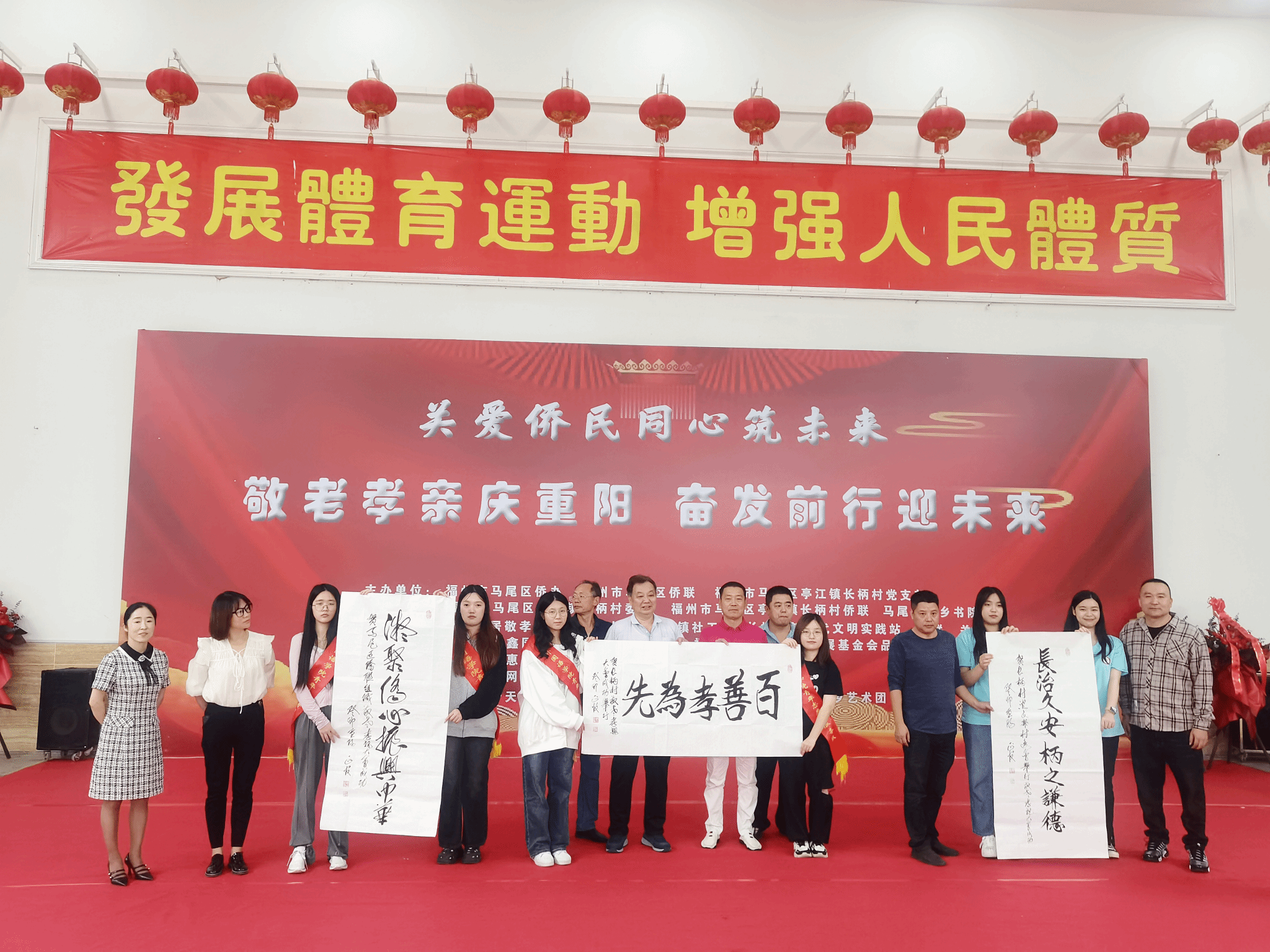 老人们手拿书法“福”字与长柄村干部、志愿者们合影