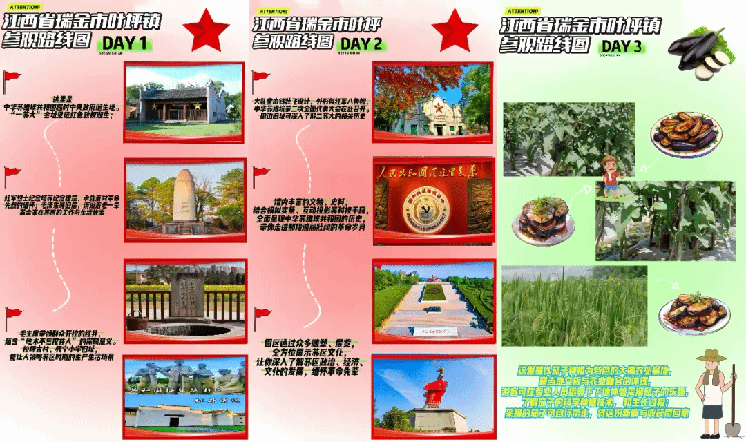 实践队深入革命圣地瑞金市,创新性地探索“红色+”发展模式,以革命旧址群为轴心,串联纪念馆等核心节点,运用数字化展示、沉浸式体验等手段,将“一苏大”会址点燃的民主星火、红井承载的为民情怀转化为可触可感的精神滋养。设计以“中央红军长征出发纪念碑”为原型的文创产品,让抽象的历史精神化作鲜活的当代符号。同时,紧扣乡村振兴,打造“红色+农业产业”研学路线,依托当地蓬勃发展的茄子产业,从田间采摘的辛勤劳作,到农家烹饪的生活实践,青年们身体力行地诠释着苏区“自己动手、丰衣足食”的艰苦奋斗精神如何在新时代焕发新的实践内涵。积极拥抱新媒体阵地,做“红色+融媒体”宣传模式,拍摄制作短视频等融媒体产品,用青年的话语体系阐述跨越时空的红色故事,让红色精神的火种在网络空间薪火相传。