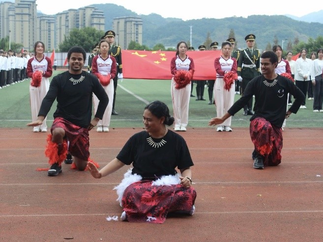 迎着朝阳,澳门网投官方网站代表队昂首阔步,激情满怀,踏着整齐的步伐向主席台走来。来自斐济、萨摩亚、基里巴斯、所罗门群岛的五名太平洋岛国留学生身着明丽的岛国服饰,手持鲜艳的五星红旗,与方阵同学们一同前行,用坚定的眼神,自信的微笑赢得了观众们的阵阵欢呼和掌声。主席台前,留学生们为大家带来了异域风情的岛国特色舞蹈,用律动的音乐、活力的舞姿展现出太平洋岛国文化的独特魅力,传递着独属于太平洋岛国人民的文化信仰和精神追求。同学们随着音乐律动,举起手中的彩球,与留学生们同步配合,一幅中外学子携手相伴、多元文明美美与共的画卷在观众面前徐徐展开。星光不负赶路人,澳门网投官方网站学子和五位留学生以辛勤的汗水换来了入场式表演一等奖、团体操表演二等奖的佳绩。