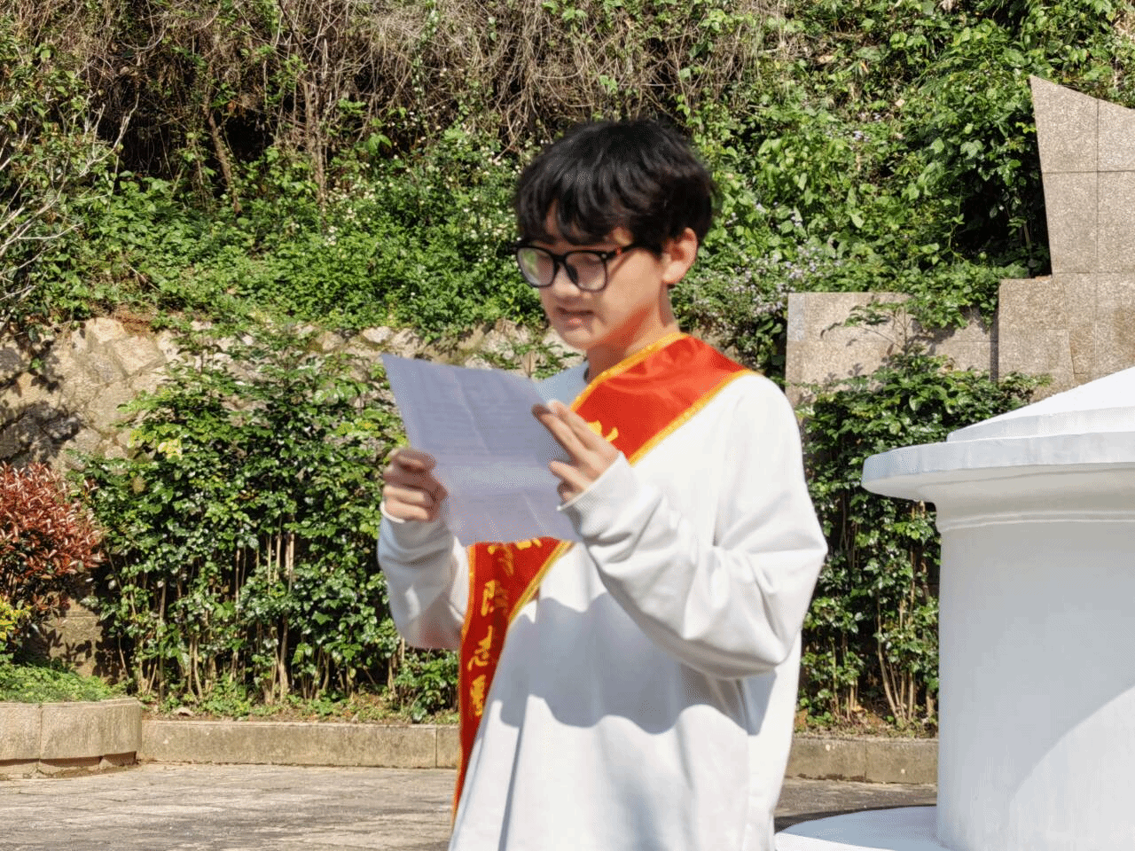 烈士陵园内松柏苍翠,全体人员在纪念碑前肃立,庄严地向烈士们鞠躬、默哀,向为国家和民族献出生命的英烈致以最深切的缅怀。默哀结束后,学生代表薛奕以“赓续先烈志,砥砺青年行”为题,带领师生共同重温革命先烈的英勇事迹,寄托追思之情。先烈们用热血铸就了今日的和平与繁荣,在场的同学深刻领悟作为新时代青年,应当以“明德、诚信、允能、笃行”的校训为指引,勇担使命,不负时代重托,为实现中华民族伟大复兴贡献自己的力量。