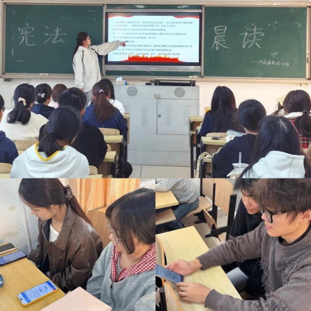 各班级通过教育部全国青少年普法网同步收看宪法晨读直播,并齐声诵读宪法条款,诵读声响亮而庄重,展现了外院学子对宪法精神的深刻理解和高度认同。晨读过后,各班围绕宪法内容展开案例研讨、知识问答及心得交流。同学们纷纷表示,通过此次活动,对宪法的权威地位与实践意义有了更深入的认识,提升了法治观念与权利意识。大家郑重承诺,将从自身做起,自觉恪守宪法原则、弘扬宪法精神,将法治内化于心、外化于行,努力成为具有坚定法治信仰、扎实专业能力、自觉守法用法的新时代优秀青年。