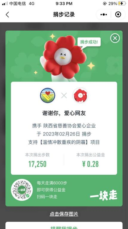 同学们通过微信“一块走”小程序,加入公益行走路线,参与本次打卡捐步活动。在活动期间内,每人每日步数至少达到8000步,并捐赠步数,将其转化为公益金在平台上向相关公益项目进行捐款。活动得到了强烈响应,同学们纷纷踊跃参与,并用自己的实际行动呼吁身边的人加入到这个行列中来,为公益活动奉献青春力量,为需要的人送去温暖和希望。